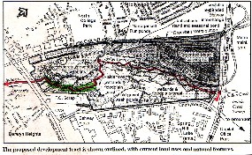 An aging sewer (?) pipeline crosses the creek. only a thin buffer of young trees remains on the stream banks.